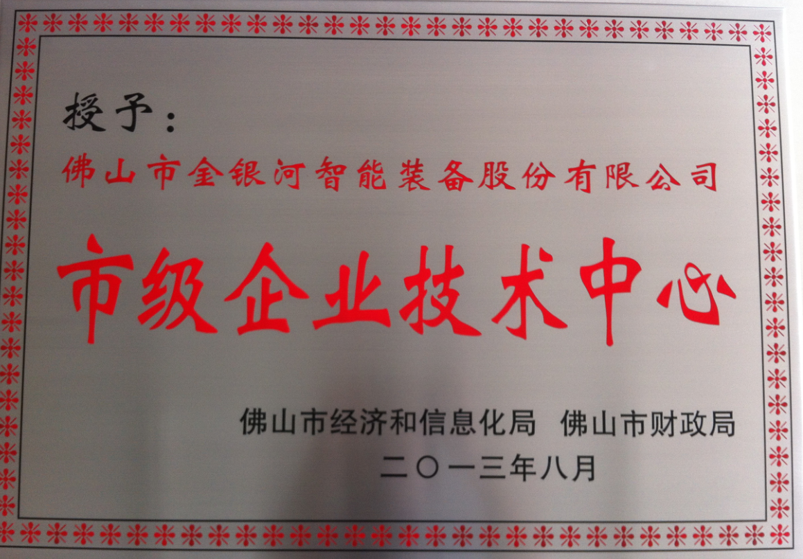 2013年8月,經(jīng)佛山市經(jīng)濟和信息化局、佛山市財政局共同簽署認(rèn)定,金銀河被認(rèn)定為“佛山市市級企業(yè)技術(shù)中心”。