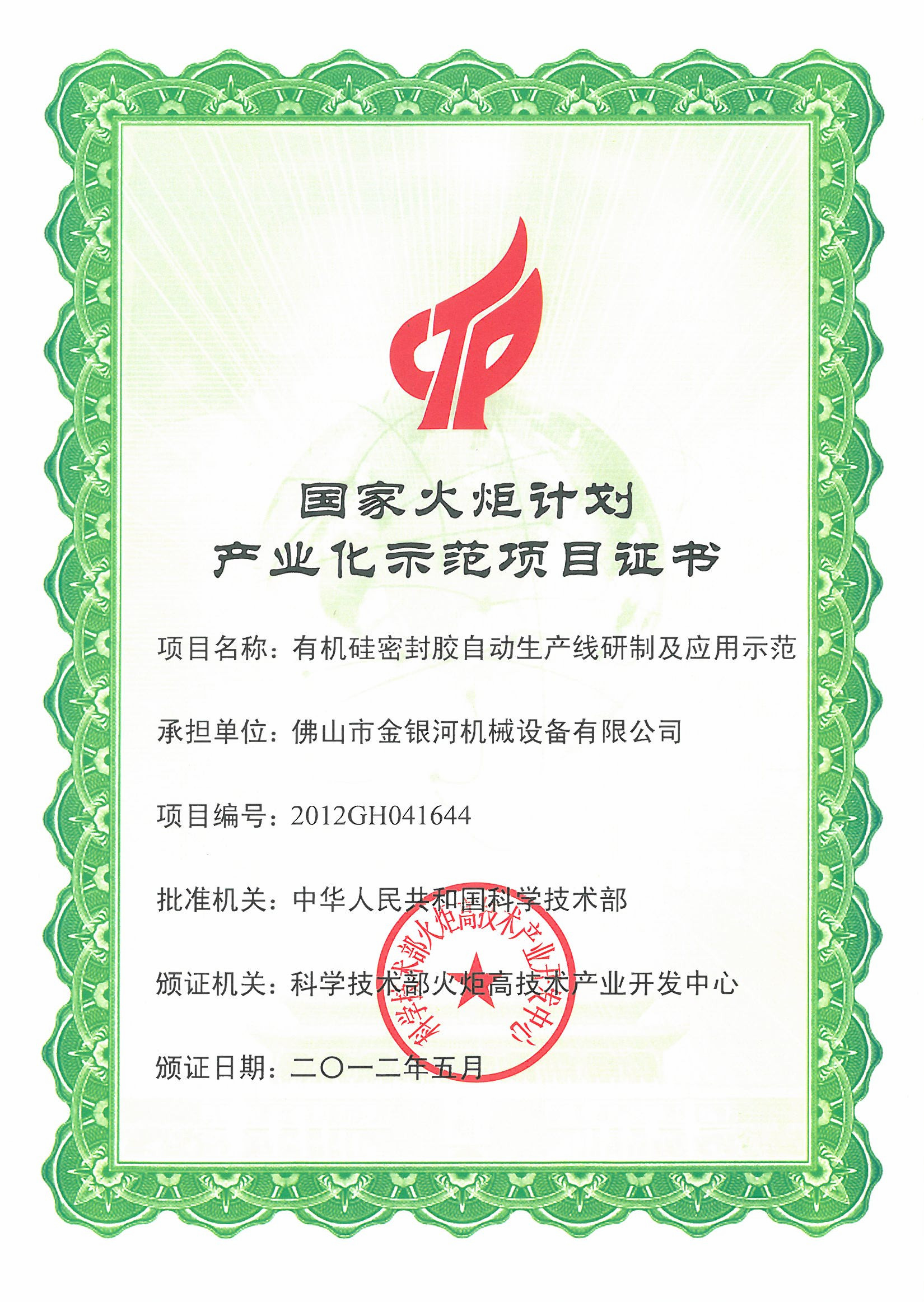 2012年5月,經(jīng)科學技術部批準,金銀河“有機硅密封膠自動生產(chǎn)線及應用示范”項目被列入國家火炬計劃產(chǎn)業(yè)化示范項目。