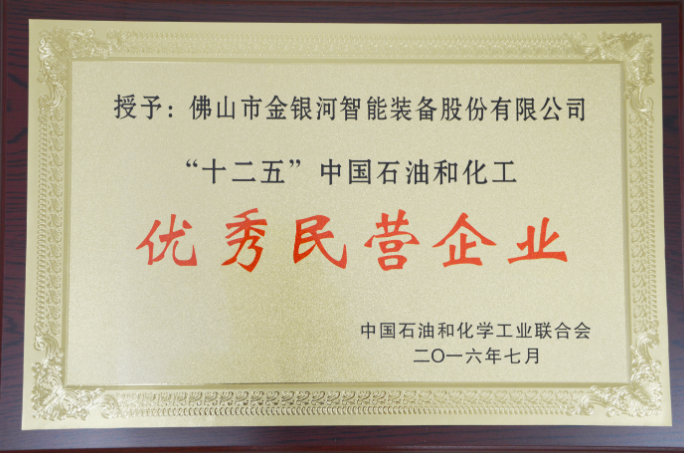 2016年7月,金銀河被中國石油和化學工業(yè)聯(lián)合會評為“‘十二五'中國石油和化工優(yōu)秀民營企業(yè)”。 金銀河不斷提高自主創(chuàng)新能力,深耕有機硅專業(yè)領(lǐng)域,做精做強,積極履行社會責任,努力為客戶創(chuàng)造價值,充分展示了一個優(yōu)秀民營企業(yè)的風采,該榮譽再次肯定了金銀河多年來對行業(yè)做出的突出貢獻。